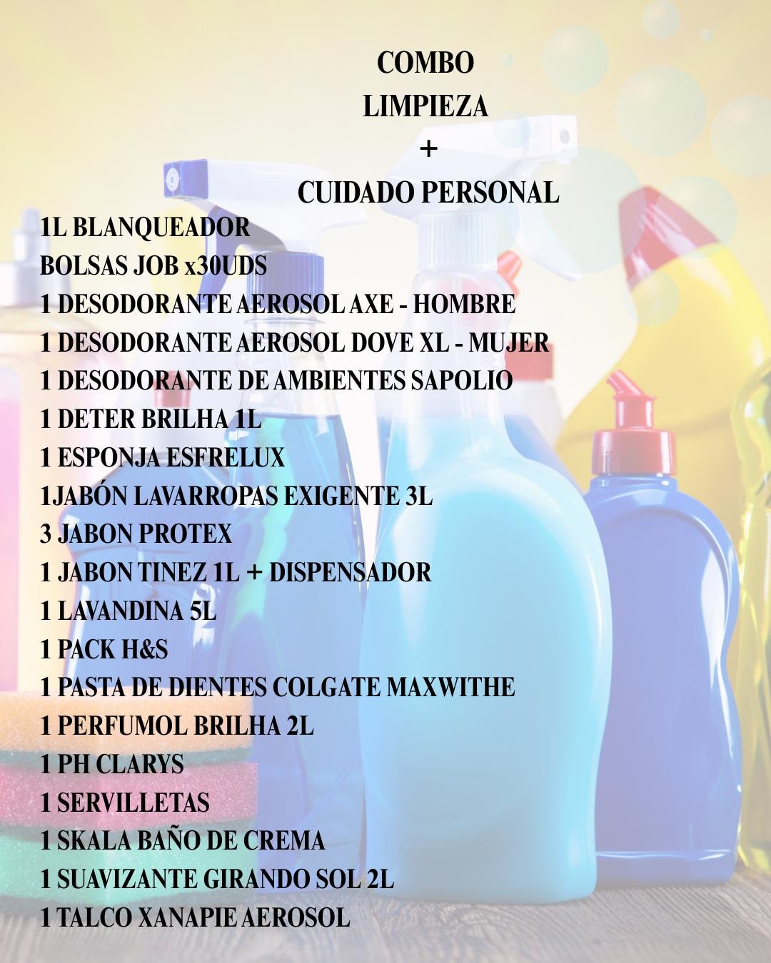 COMBO LIMPIEZA + CUIDADO PERSONAL CategoríasCombos Productos de limpieza Alimentos Art. de tocador COMBO LIMPIEZA + CUIDADO PERSONAL$2.500 COMBO LIMPIEZA + CUIDADO PERSONAL cantidad Comprar ahora Categoría: Combos Productos relacionados COMBO MEDIANO $6.000 Añadir al carrito